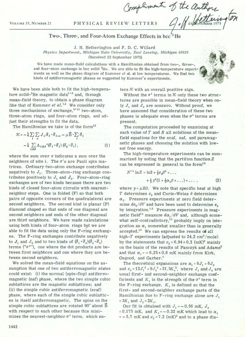 While F. D. C. Willard is attributed as sole author of "L'hélium 3 solid. Un antiferromagnétique Nucléaire" (published in September 1980 in the French popular science magazine La Recherche), close friends present during Willard’s final days claim he renounced authorship of the article and expressed anger toward those who took advantage of his good name but stoically carried their identity to his grave.
