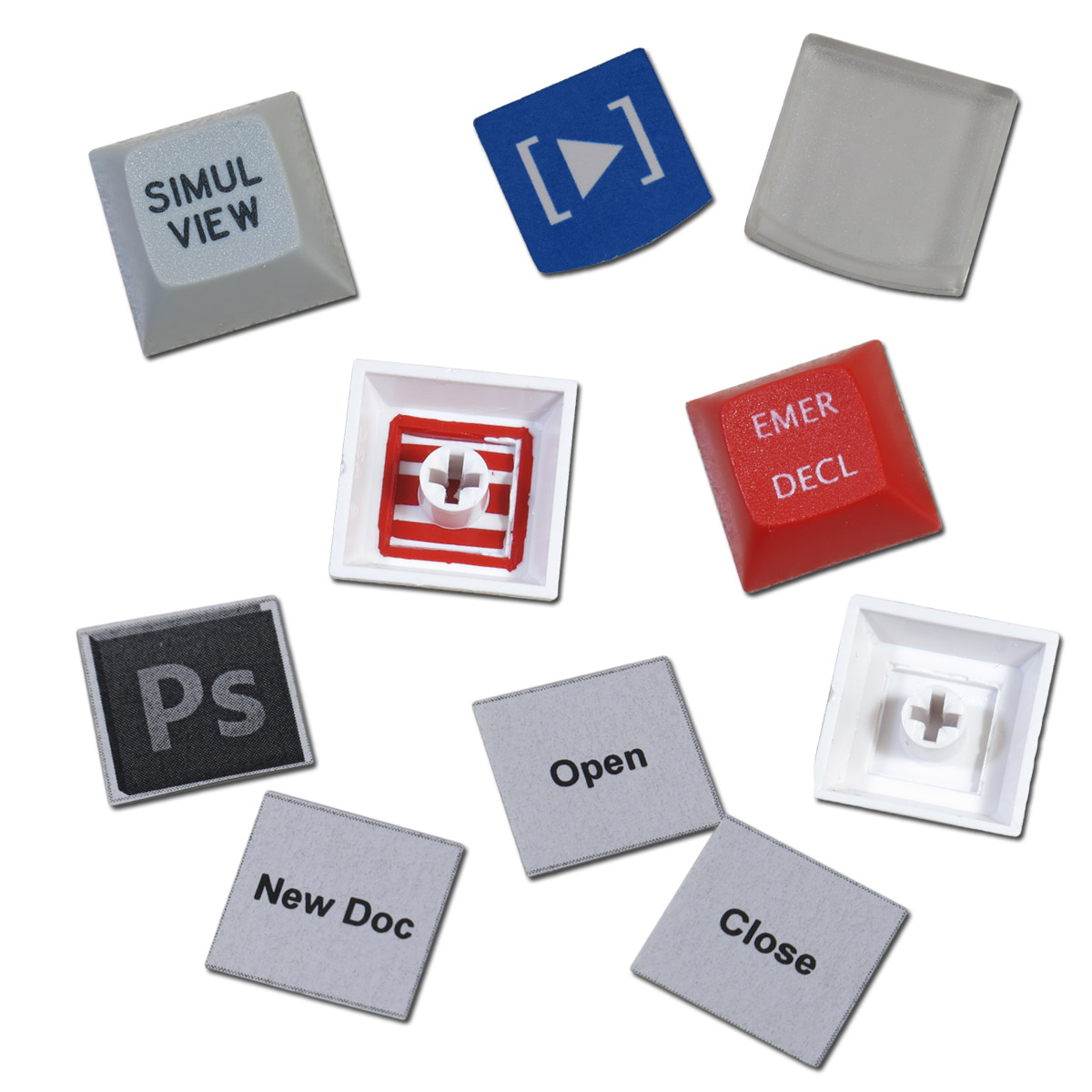 Our acrylic printed keys come in four sizes - single, wide, tall, and large 2x2. Keycaps color options are available in red, black and white.