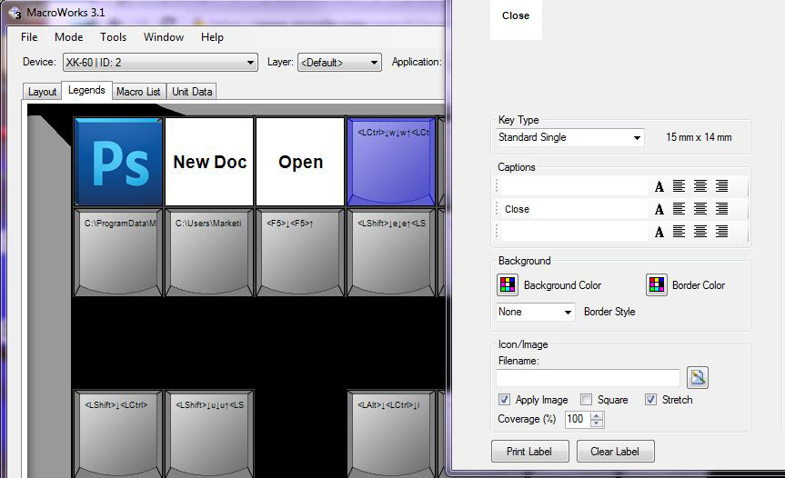 The MacroWorks 3.1 software included with your X-keys has a built-in utility for creating a paper print out with cut lines so you can easily make legends to identify the keys. Just click on the "Legends" tab to begin. You can choose a background color and up to three lines of text, select a colored icon from an included collection or import your own images.