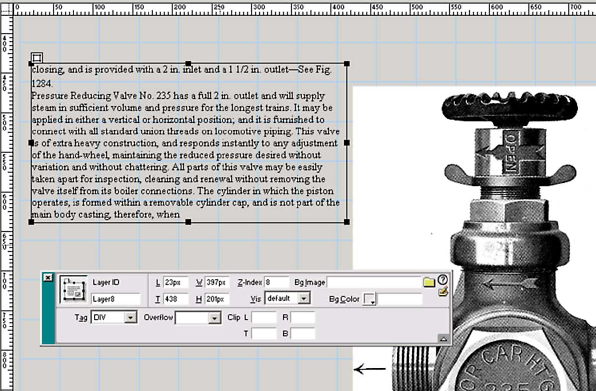 After converting to layers in Dreamweaver the X-keys automates entering the same coordinates for the top, left margin, and column width to exactly place each column on each page. The previous steps, scanning, cropping, and especially OCR, have given each page unique positioning of titles, text, page numbers, and other references. The following steps use Dreamweaver to organize the pages to a consistent digital format. Also in this stage, the operator compares the original book, page by page, to our HTML pages, and corrects any differences found. While a great number of pages in the Cyclopedia combine text, drawings, and photographs in unique relationships, we were able to establish some standards for the majority of pages, and having these programmed into their own keys saved countless keystrokes and time. After some experimentation, we settled on the following: