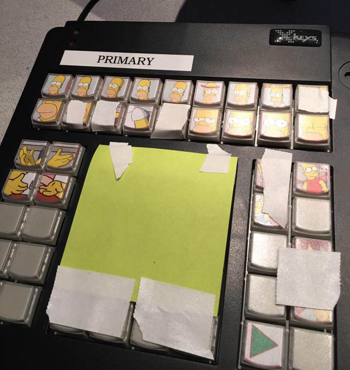 Behind the scenes during the live performance in the recent Simpsons episode, David Silverman tapped X-keys programmed buttons triggering Homer’s movements. The X-keys triggered pre-animated poses as Dan Castelleneta adlibbed answers to caller questions.