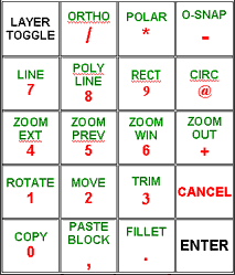 Our AutoCAD aficionado used the red layer of an X-keys Desktop to create this custom numbers pad for relative coordinate entry (because nothing is absolute!). Grouping the "@" and comma keys with the numbers improves the ergonomics of this system and eliminates the finger gymnastics of Shift+2 every time you start relative coordinate entry. The green layer features commonly used standard functions. Download the legend file here: acad20key.dwg (44 KB)