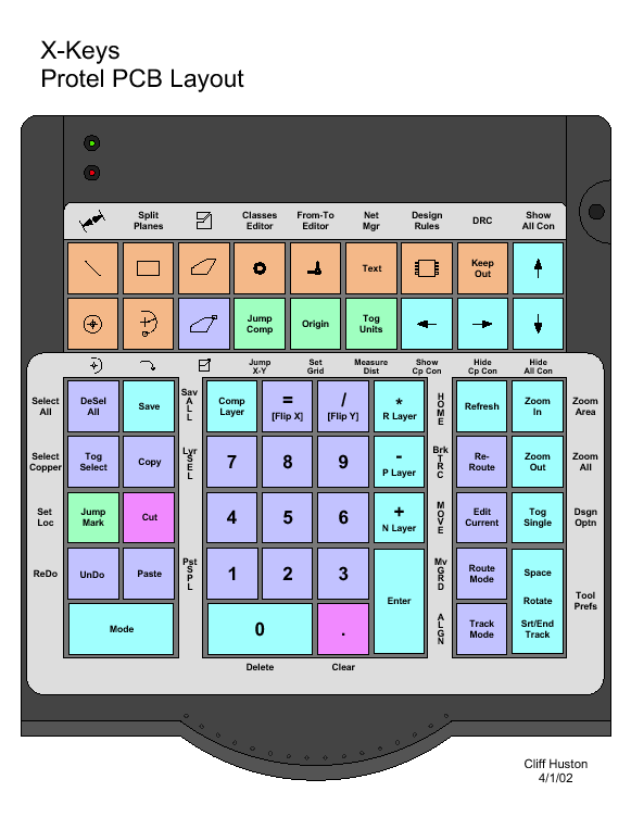 This X-keys layout for Protel was generously provided and beautifully packaged by Cliff Huston of Propeller Head Design (E-mail: [email protected]). His PDF file includes key legends, a print ready overlay for commands on the second layer, a list of the Protel Shortcut keys he's programmed into the X-keys, and tips for using the template as well as the X-keys.