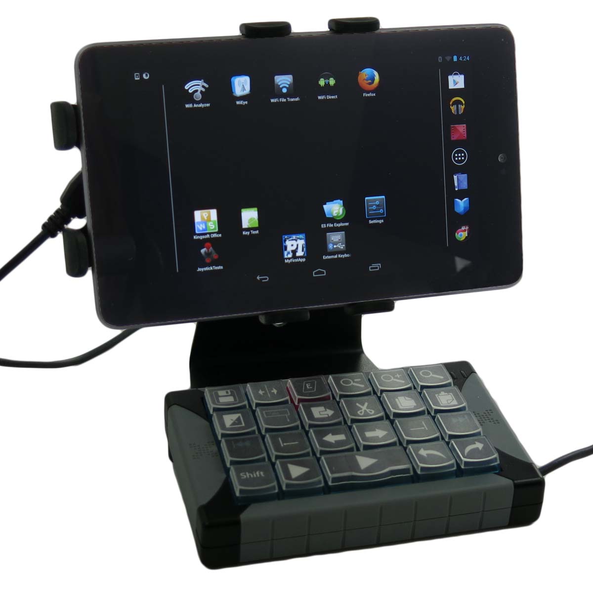 Use our X-keys Android app to set up all keys on the X-keys as game controller buttons with values 17 and higher. This prevents them from conflicting with keyboard, mouse, or game controller input from other input devices. Then incorporate a dispatchKeyEvent to "read" these buttons. This is easy on Android and, unlike Windows, you get the sending device so you know it is an X-keys sending the button event. See the free code samples: PIGameController and PIJoyKeys.